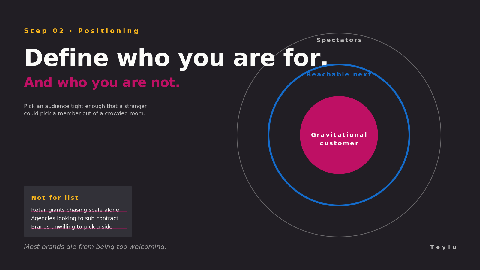 Now write the list nobody writes. The "not for" list. Three to five kinds of customer you will deliberately not serve. If the list feels transgressive, good. That means you have stopped being polite and started being a brand.