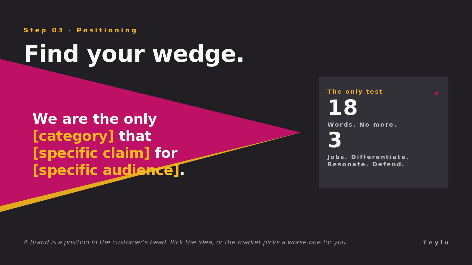 A wedge is a single sentence that compresses your brand to its smallest, most defendable claim. It differentiates (it separates you from the obvious alternative), it resonates (it maps onto something the customer already wants), and it defends (you can prove it, today, with current capability).
