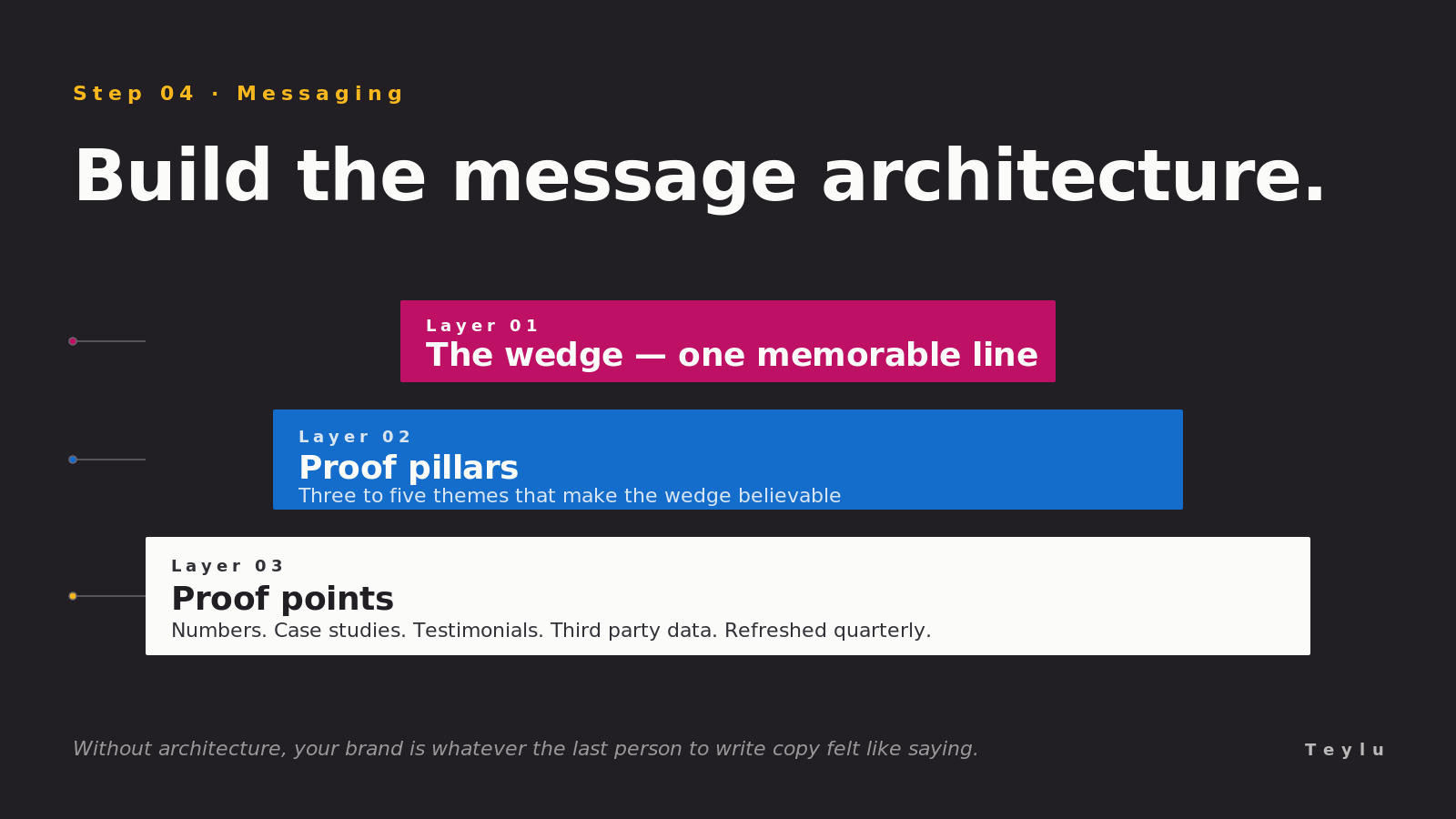 Underneath the wedge sit three to five proof pillars. Themes that make the wedge believable. Under each pillar sit the proof points. Stories, numbers, quotes, case studies, third party validation. That is the whole architecture.