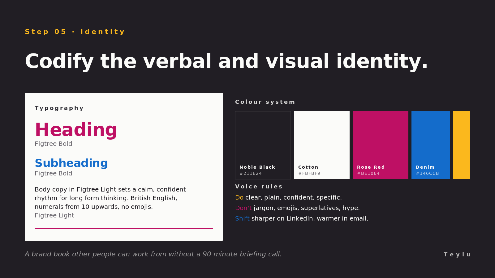Brand books die because they get written for the people who built them. That is a mistake. Write the brand book for the designer you have not hired yet, the agency you have not briefed yet, the copywriter who will cover maternity leave in eighteen months. If all three of those people could open the book, do the work and produce something on brand without a 90 minute explainer, you have a brand book. If they could not, you have decoration.