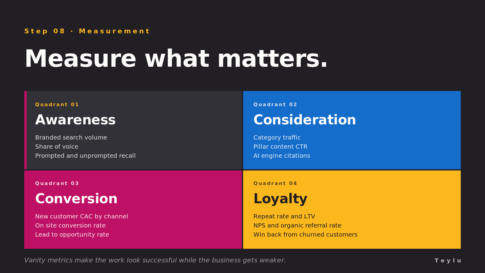 Measure these four categories. Awareness (branded search, share of voice, unprompted recall in customer surveys). Consideration (traffic from brand and category terms, time on key pages, AI engine citation tracking). Conversion (new customer CAC, on site conversion rate, lead to opportunity rate). Loyalty (repeat rate, lifetime value, referral rate, win back rate).
